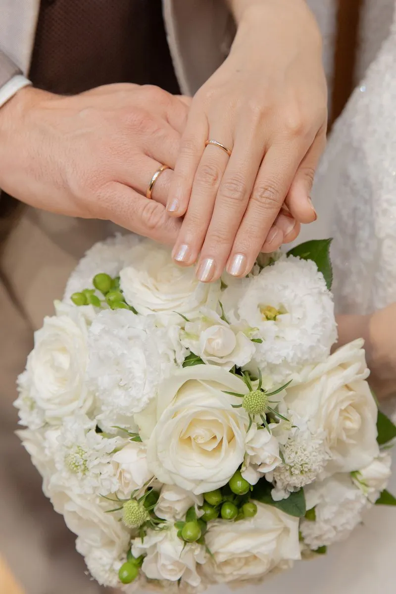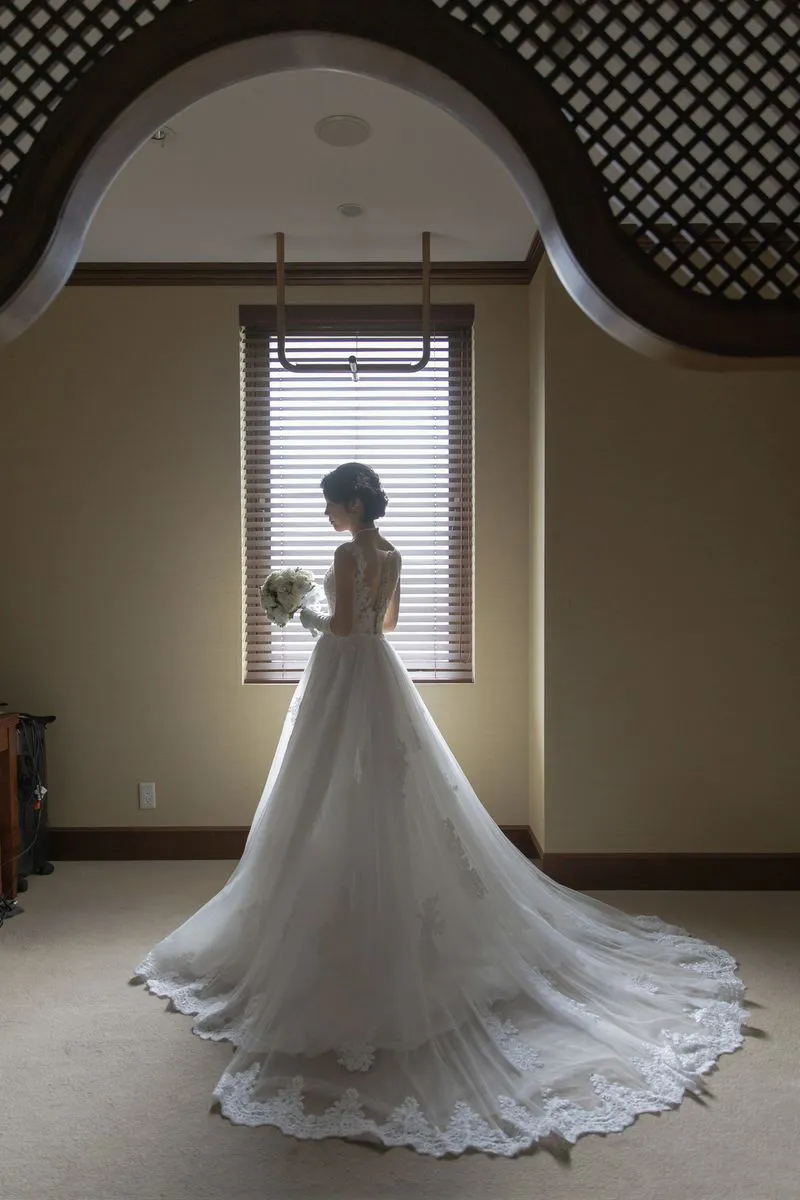 ウェディングドレスはFOUR SIS & CO. (フォーシス アンド カンパニー)のAラインドレスです。胸元のビーズの刺繍と、プリンセス感のあるシルエットが気に入っています。婚約指輪はIsabel Guarchのもので、夫の地元であるマヨルカ島の人気デザイナーさんのブランドです。結婚指輪は「結婚指輪といえばTiffany & Co.」というイメージがあって憧れだったので選びました!