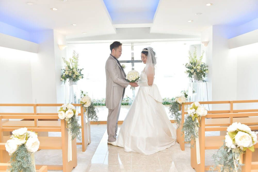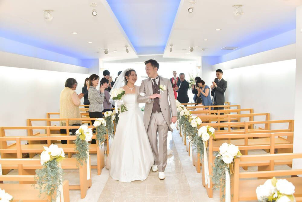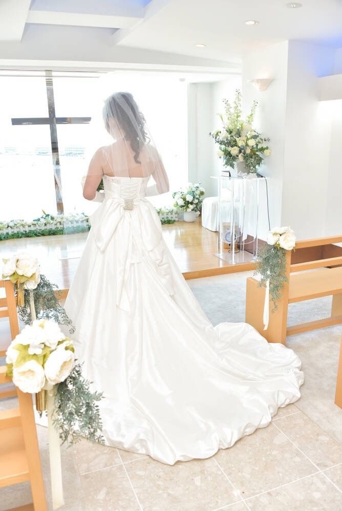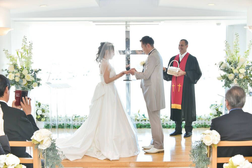 天井に海をイメージした青い照明があるチャペルで、女性の憧れであるバージンロードを歩き、横浜らしい景色を一望しながらの挙式は最高でした!