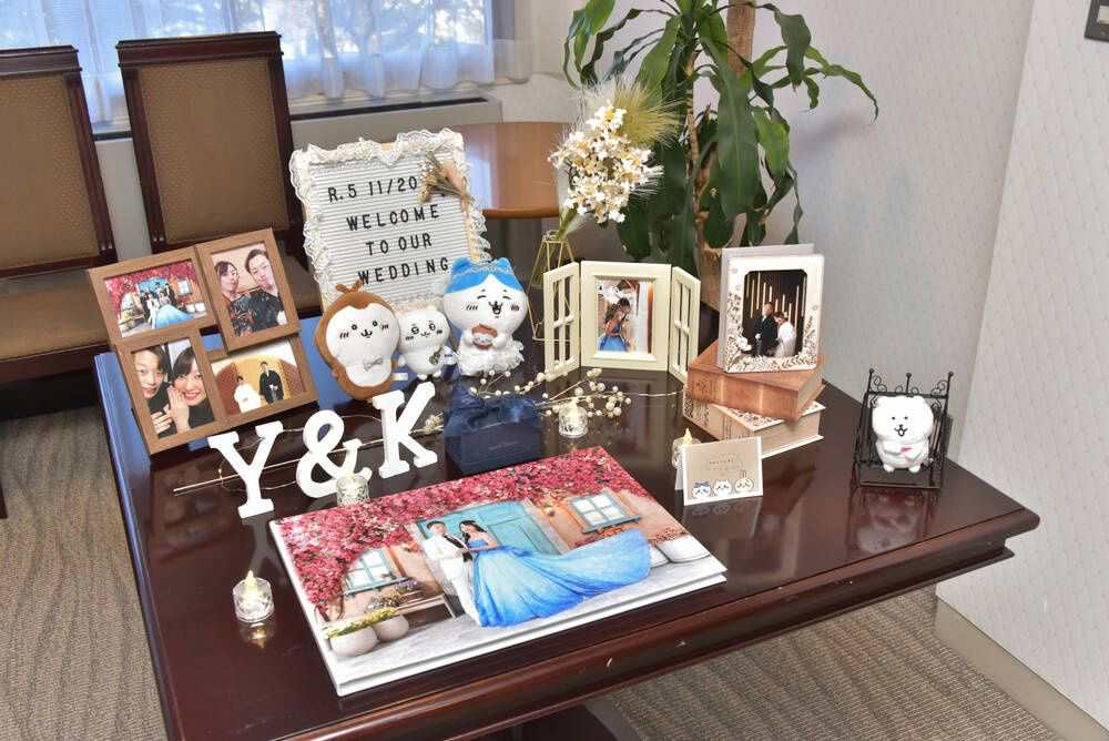 また、自分達が生まれ育った横浜らしい雰囲気にしたかったので、会場を”海”のイメージにしたこともこだわりです。ほかにも、ウェルカムスペースに大好きな「ちいかわシリーズ」のぬいぐるみを置いて、ゲストを温かくお迎えするようにしたり、装飾はピンクとオレンジをメインにし、温かみのあるコーディネートにしたりしました。