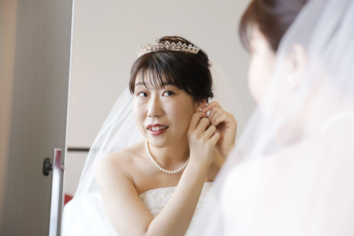 アイテム選びでは、ウェディングドレスはAラインでレースの模様が気に入ったものに即決、アクセサリーはパールのネックレスやイヤリングなどを合わせました。