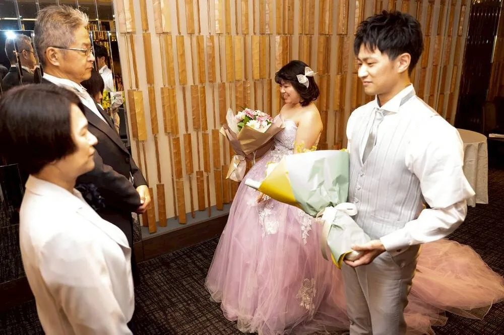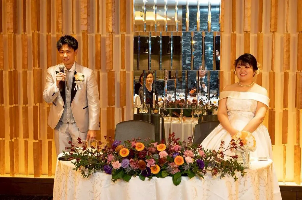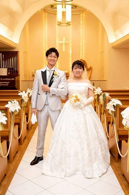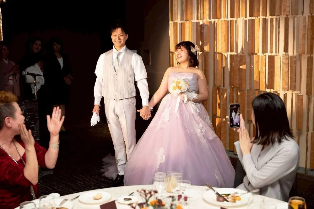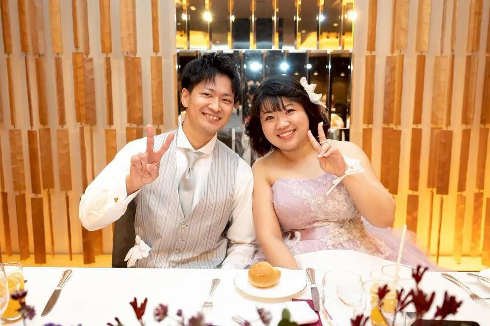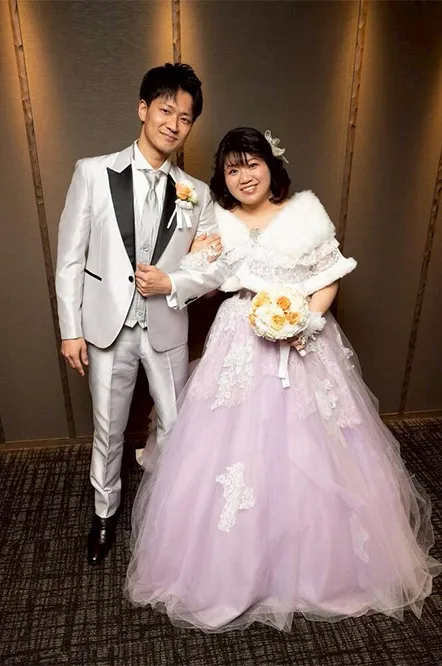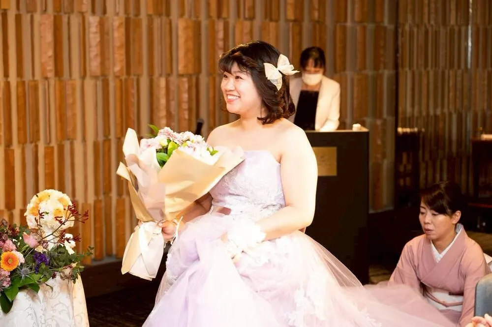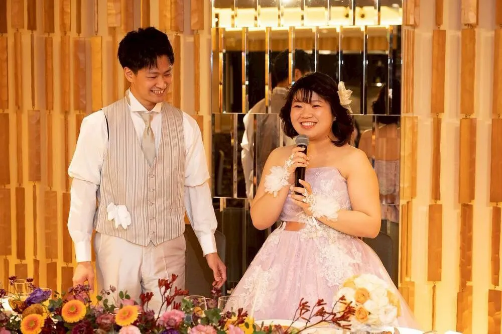 ドレスやヘアメイクにもこだわった点があります。1着目のウェディングドレスに選んだのは、夫が「綺麗で清楚な感じで良いんじゃないか」と一目惚れしたもので、特に刺繍の柄が気に入ったそうです。お色直しは、私が好きなラベンダーのカラードレスを選びました。私は松田聖子さんのファンなので、聖子ちゃんヘアにしてもらったのがこだわりです!