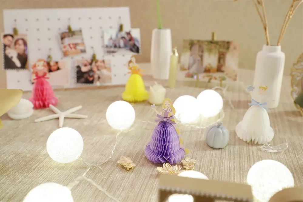 ドレスは、シンプルながらレースが施された大人っぽいデザインのものを選びました。また、ディズニーが好きなので、ウェルカムスペースはディズニープリンセスをテーマに飾り付けをしています。