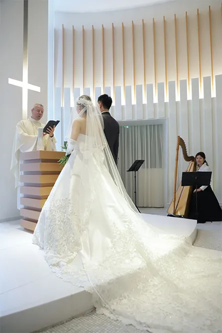 チャペルは、白と茶色を基調にしており、シンプルながら目を引くデザインに惹かれました。楕円型の造りで、中に入ると味わったことのない感覚になるところも魅力です。当日はハープの生演奏もあり、とても素敵でした!また、チャペルに入るまでは、外の空気も感じられるので、ガーデン挙式の雰囲気も楽しめて良かったです。