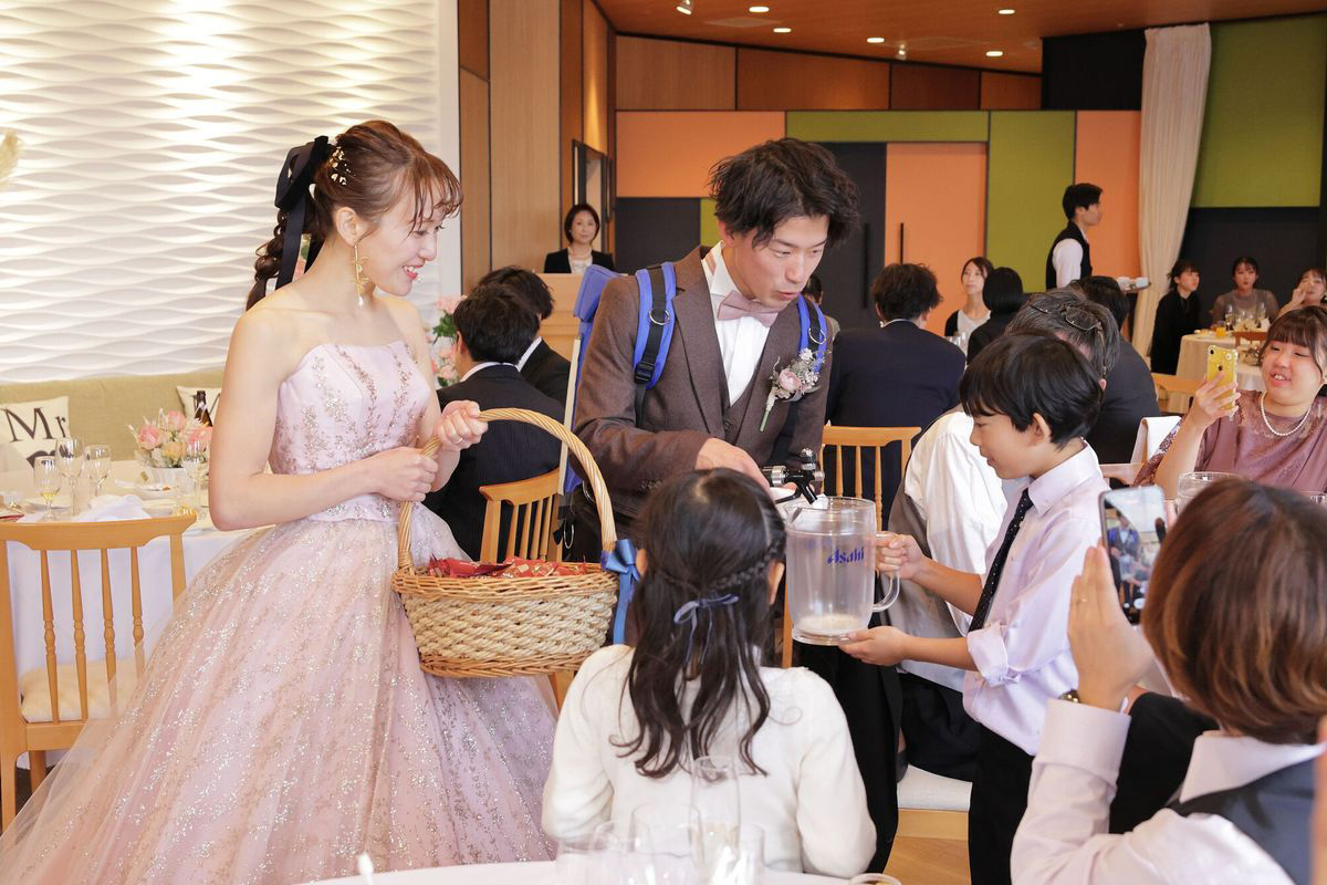 ゲストと楽しめる演出として、お色直し後の入場ではビールラウンドをしました。泡しか出ないというハプニングもありつつ、それも含めて楽しんでくれましたし、みんなと話せたのも良かったです。