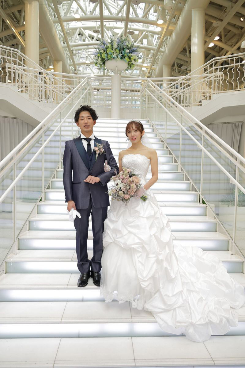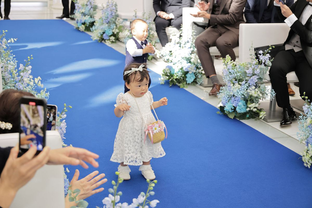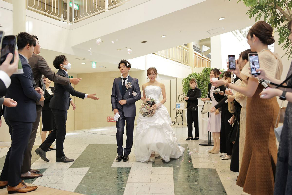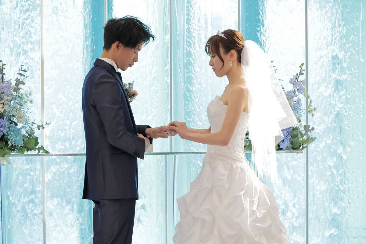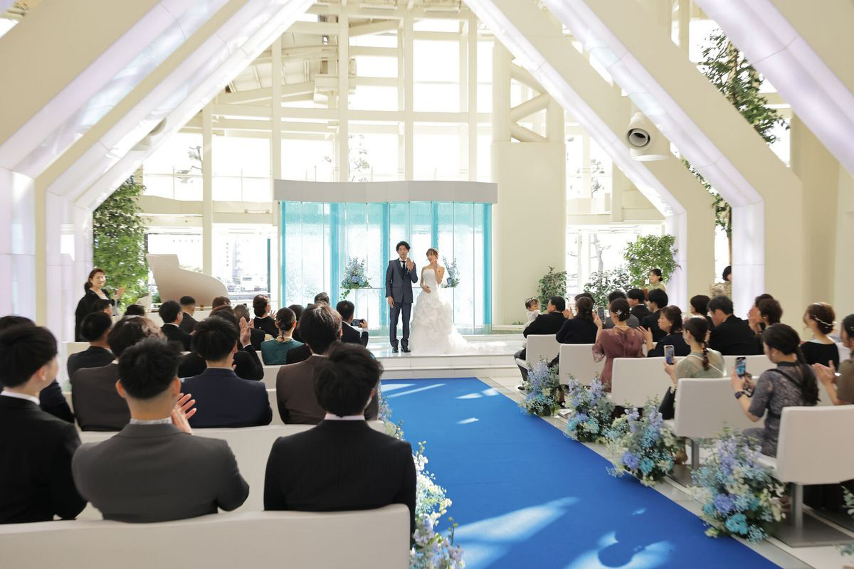挙式会場は、天井が高くガラス張りで、太陽光がとても綺麗でした。正面の青いウォーターカーテンも美しく映え、ゲストの表情を綺麗に写真に残せました。