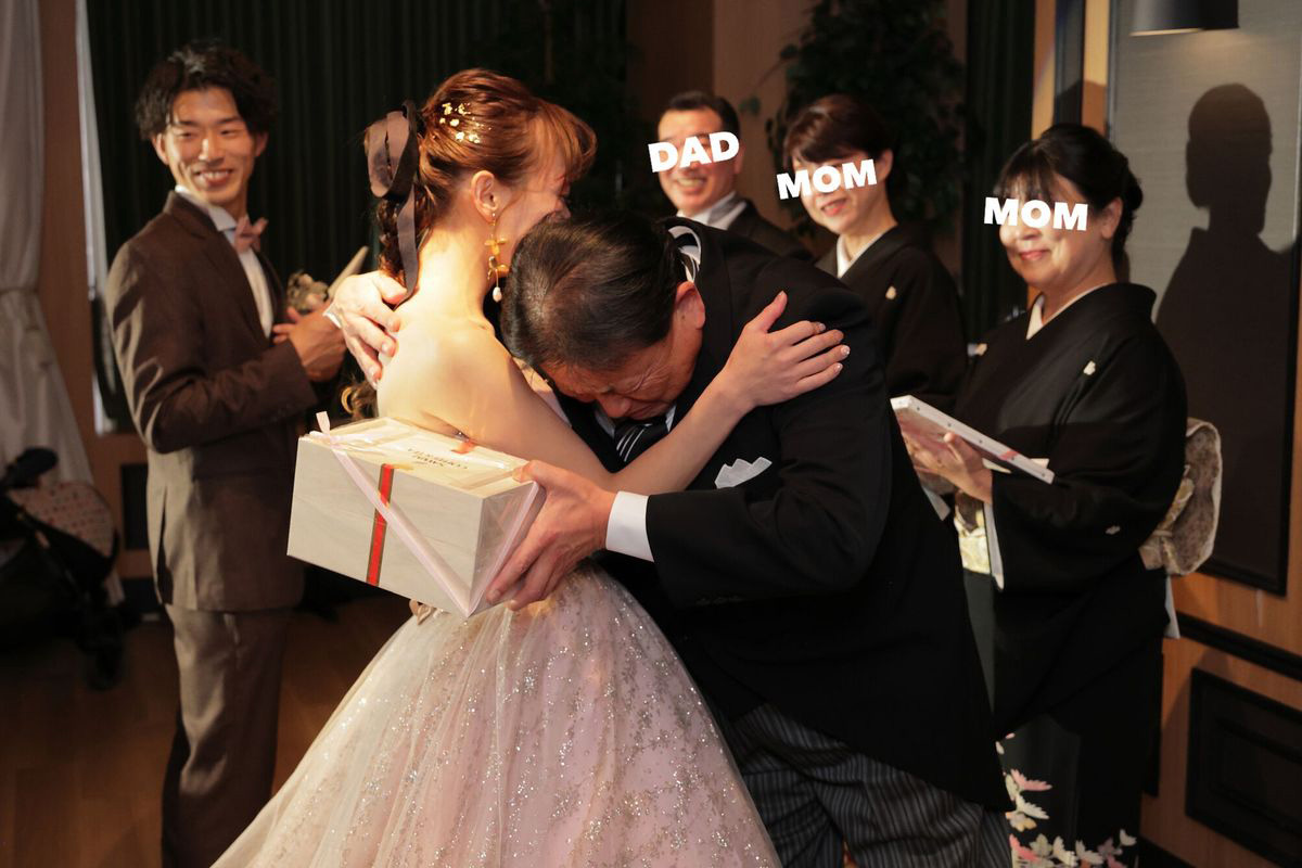 披露宴会場はウッド調で、アットホームな雰囲気を作ることができました。そのおかげか終始緊張せず、入退場時に全テーブルのゲストと接することができて良かったです。花嫁の手紙を読み終えて、両親贈呈品を渡す際、父を抱きしめたら父が大号泣し、色んなことが蘇ってきて、涙が止まりませんでした。
