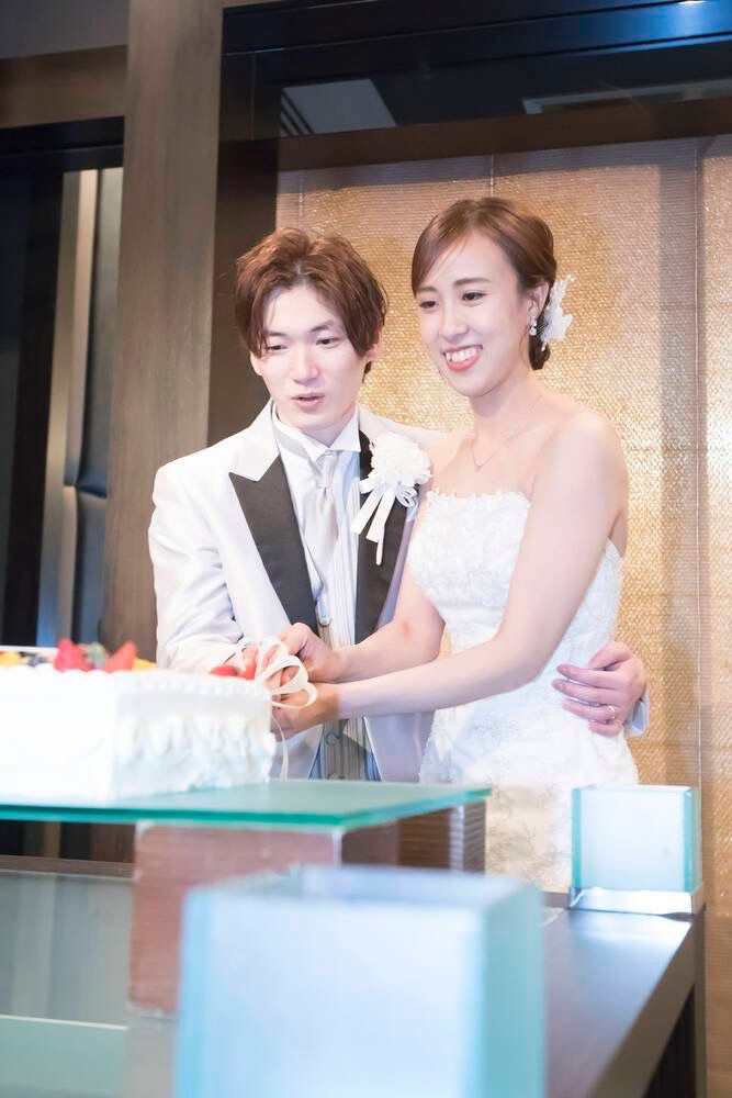 「スマ婚」を選んだことで、全体の費用がだいぶ抑えられました。装花や料理・ケーキなどがプランに含まれていて、いくつかの選択肢から選べます。装花は、会場の雰囲気に合わせたタイプを選びましたが、当日初めて見たところ、緑がたくさん使われていて、とても写真映えしました。ウェディングケーキは、プラン内のスクエア型の一段ケーキで苺や果物が乗ったものにし、娘たちにもファーストバイトをしました!