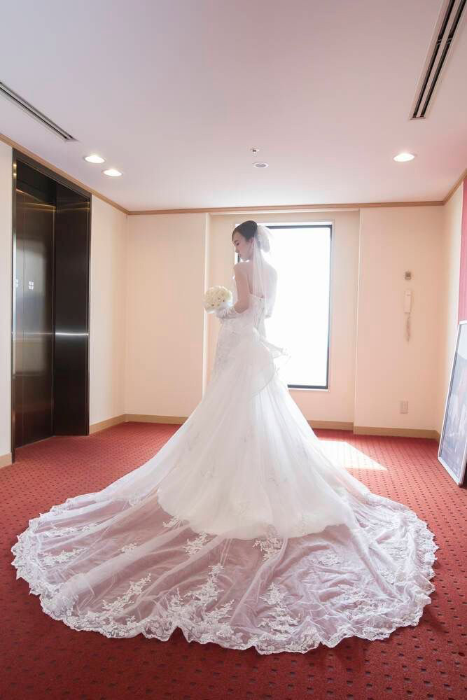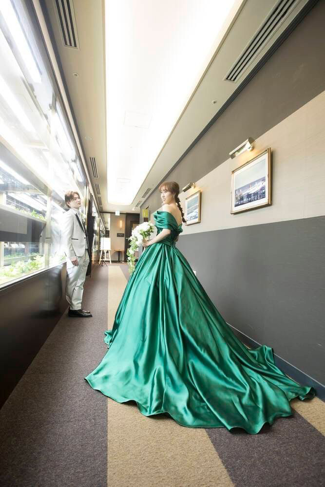 ウェディングドレスは、体型を活かしたマーメイドラインを選びました。王道のウェディングドレスよりも、自分らしく着こなせたと思っています。2着目は、ウェディングドレスからガラッと雰囲気が変わるようなものを探し、好きな緑色でふんわりしたラインのカラードレスにしました。希望にドンピシャのドレスに出会い、即決でした!